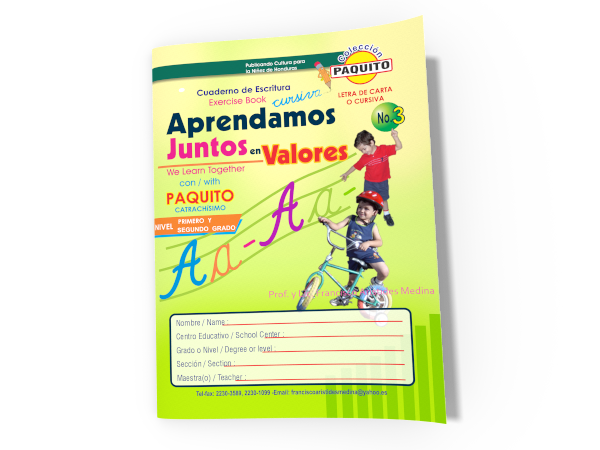 Nuevo Libro de Escritura tamaño carta diseñado a base de letra de molde o de imprenta, con ejercicios básicos de la etapa preparatoria, vocales, sílabas, palabras, frases y oraciones. Todos acordes a los contenidos del Libro de Lectura Paquito Lee y Paquito Trabaja del Primer Grado.
